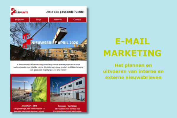 Voor Klein Units verzorgen we de contentplanning en denken we mee over de invulling van de communicatie. Dat doen we niet alleen door teksten te maken, maar ook door overzicht te houden, ideeën aan te dragen en te zorgen voor regelmaat in de plaatsing. Zo blijft de content in beweging en sluit die aan op wat er speelt in de organisatie.